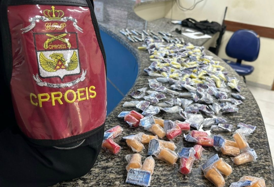 Na rua Palmira Ribeiro de Souza, local já conhecido pelos agentes, foram encontrados 136 pinos de cocaína e 23 buchas de maconha.