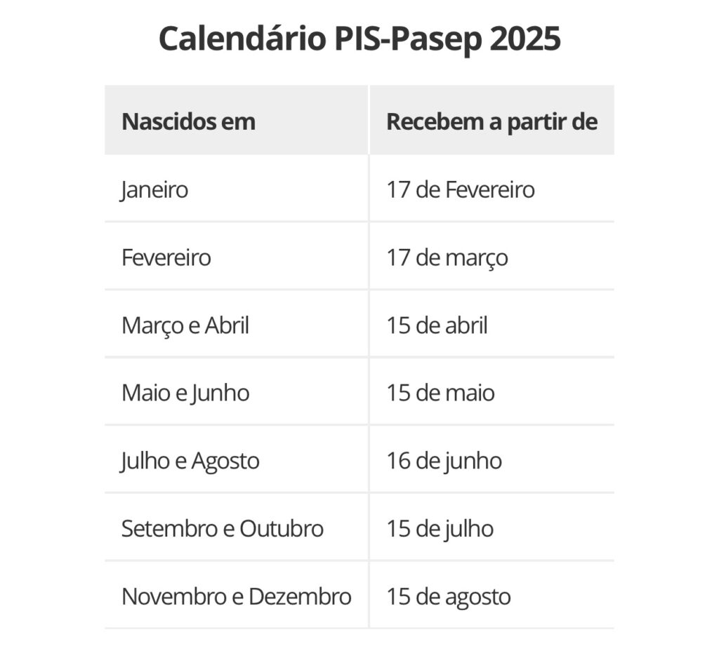 O PIS é pago pela Caixa Econômica Federal; e o Pasep, pelo Banco do Brasil (BB). Como ocorre tradicionalmente, os pagamentos serão divididos em seis lotes, baseados no mês de nascimento. Os saques terão início nas datas de liberação dos lotes e acabarão em 29 de dezembro de 2025. Após esse prazo, será necessário aguardar convocação especial do Ministério do Trabalho.