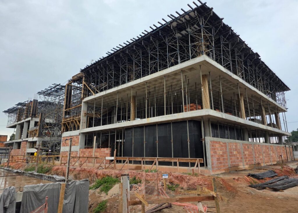 A etapa de fundação foi concluída e a concretagem do terceiro pavimento acaba de ser finalizada, marcando um estágio estrutural importante da obra. Paralelamente, estão em andamento os serviços de alvenaria, fechamento dos pavimentos e instalação dos reservatórios enterrados. Também já começou a escavação da área que receberá a piscina, um dos principais atrativos do complexo.