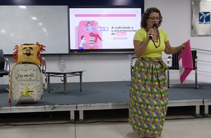 “Parafraseando Paulo Freire, a educação é um ato de amor e de coragem (…) Ainda bem que a gente tem a gente. Hoje vamos falar de ludicidade e encantamento para tratar da questão da leitura. Para isso, também temos que estar encantados”, salientou a primeira palestrante, a orientadora educacional, neuropsicopedagoga e contadora de histórias, Mônica Reis. Com adereços e recursos lúdicos, ela apresentou a ‘História do Leão que não Sabia Escrever’, de Martin Baltscheit, abrindo sua palestra com o tema ‘A ludicidade e o Encantamento da Leitura’.